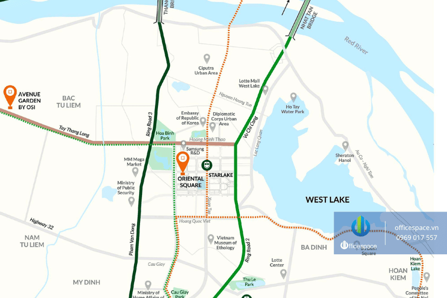 Tọa lạc tại vị trí đắc địa giữa lòng khu đô thị Starlake Tây Hồ Tây, Oriental Square không chỉ gây ấn tượng bởi kiến trúc hiện đại, sang trọng mà còn tiên phong dẫn đầu xu hướng thiết kế văn phòng xanh tại Hà Nội. Là một trong số ít những dự án văn phòng hạng A đạt chứng nhận LEED Gold danh giá, Oriental Square được phát triển bởi OSI Holdings với tổng diện tích sàn lên tới 28.652 m2, mang đến không gian làm việc hiện đại, tiết kiệm năng lượng và thân thiện với môi trường.