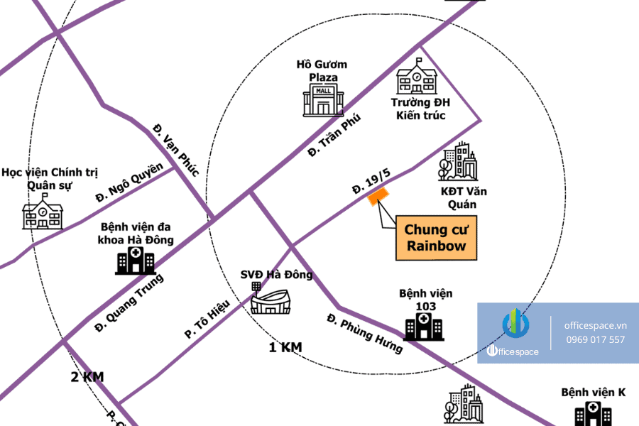 Văn phòng tòa nhà Rainbow Văn Quán tọa lạc tại trung tâm Khu đô thị Văn Quán, phường Hà Đông – khu vực phát triển năng động với hạ tầng đồng bộ, dân cư đông đúc và cộng đồng doanh nghiệp ngày càng mở rộng. Nhờ lợi thế nằm trên trục đường 19/05, tòa nhà sở hữu khả năng kết nối thuận tiện tới Nguyễn Trãi, Trần Phú, Khuất Duy Tiến và các quận nội thành, giúp doanh nghiệp dễ dàng giao thương, gặp gỡ đối tác cũng như tuyển dụng nhân sự.