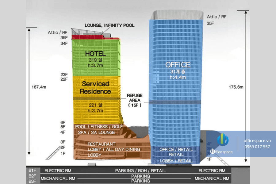 Tòa nhà gồm 02 Khối Văn phòng và Khách sạn cao 35 tầng, 03 tầng hầm