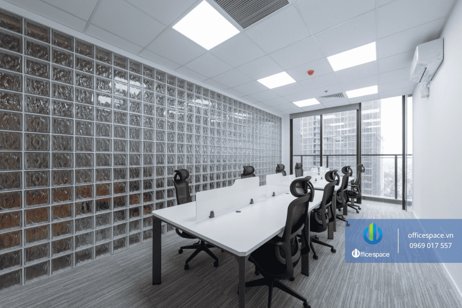 Không gian sử dụng tông màu trắng sáng chủ đạo, nội thất mới, bàn ghế kích thước lớn và bố trí khoa học. Phòng riêng nhỏ nhất dành cho 4 nhân sự, phù hợp với startup, văn phòng đại diện hoặc nhóm dự án.