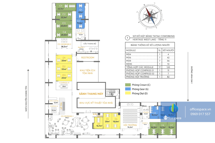 Cơ sở được bố trí tại tầng 11 và tầng 12 của tòa tháp Heritage West Lake, với tỷ lệ phân bổ công năng thông minh: